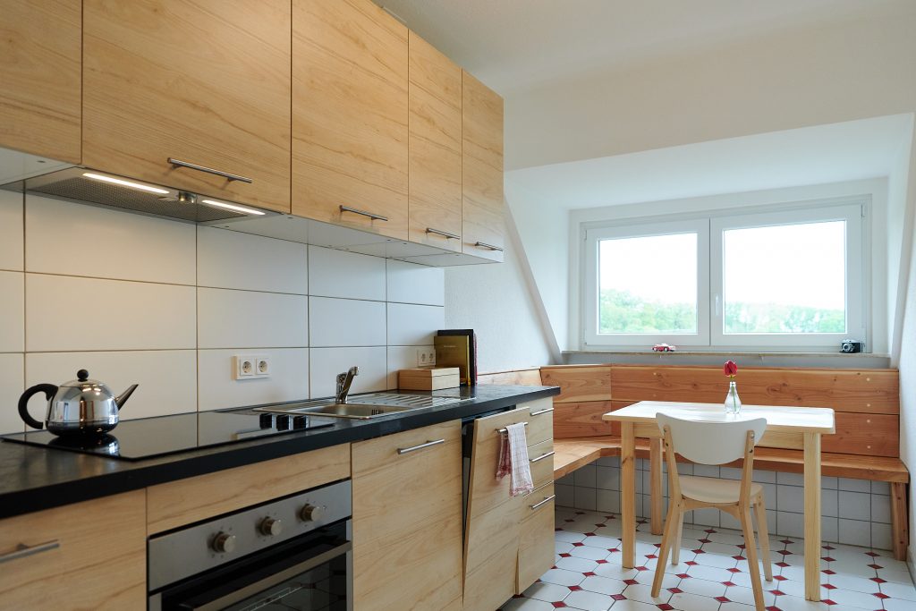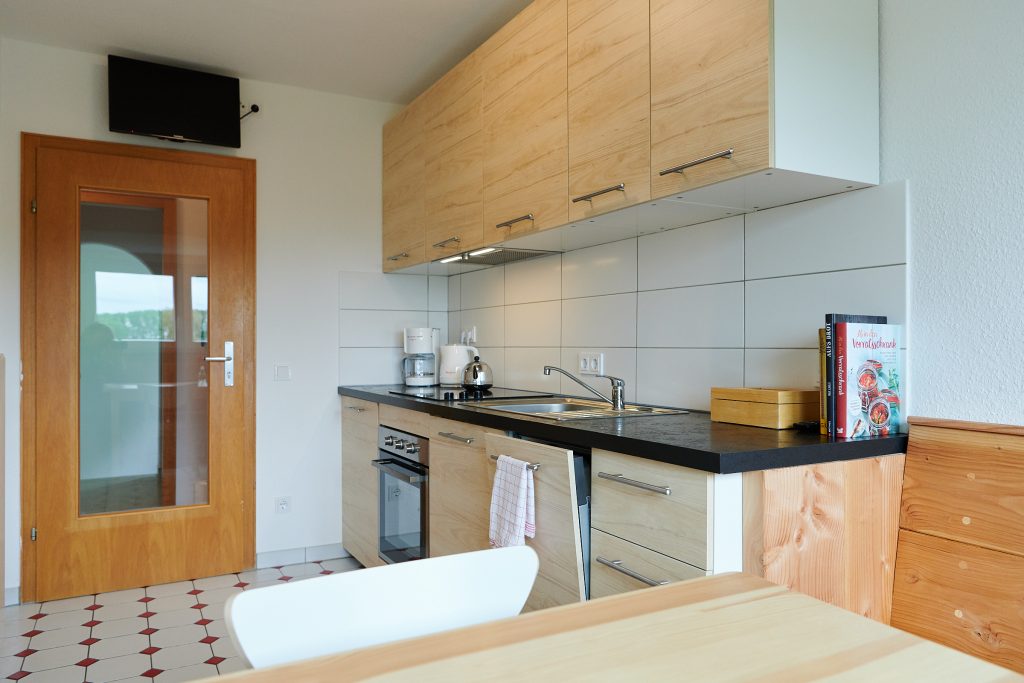 Die Küche ist voll ausgestattet mit Herd, Backofen, Kühlschrank, sowie den notwenigen Utensilien wie Wasserkocher und Kaffeemaschine. Töpfen, Pfannen, Tassen, Teller, Gläser, Besteck etc. gibt es natürlich auch. Das Appartement verfügt über 4 Flachbildfernseher mit SAT-Empfang (3x Schlafzimmer, 1x Wohnküche) sowie eine Waschmaschine.